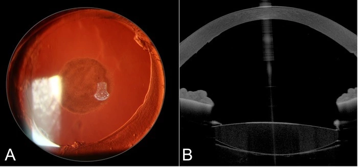 Photos A & B Clinical case of a patient with localized IOL opacification in the left eye following DMEK. A: Slitlamp photograph in retroillumination, B: Anterior segment optical coherence tomography image. Apart from the central IOL opacity, the attached DMEK lamella can be visualized at the cornea’s posterior side.
