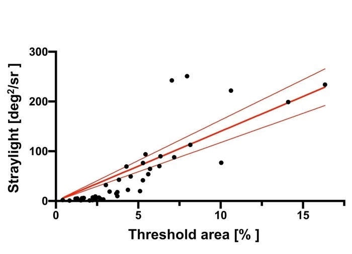 Chart: Threshold area (x-axis) and straylight value (y-axis) had a statistically significant correlation, with R2=0.80, P<0.001. The red lines show the fitted linear regression with 95% confidence intervals.