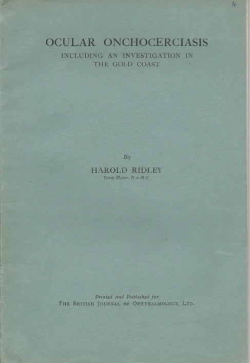 In 1941 during his war assignment in the Gold Coast (today Ghana), Ridley was appointed part-time sanitation officer and headquartered at the capital city of Accra. At that time, Ridley met Brigadier G. M. Findlay, AMS., with whom he pursued investigations on onchocerciasis. Ridley, Findlay, and Captain John Holden journeyed to Funsi, 90 minutes north of Accra*, to study onchocerciasis. They worked for two weeks, examining patients with a slit-lamp, which ran off a motor-vehicle’s 12-volt battery*. Ninety percent of the patients had onchocerciasis; ten percent of these were blind. Conditions were primitive and most of the work, even fundus painting and photography, was done by Ridley. His classic fundus painting, sometimes termed the “Ridley fundus” of onchocerciasis was completed in Accra after his return from the Bush. The attention he called to this disease constitutes one of Ridley’s major contributions. His monograph “Ocular Onchocerciasis” published in 1945 in a supplement of the British Journal of Ophthalmology was a landmark.