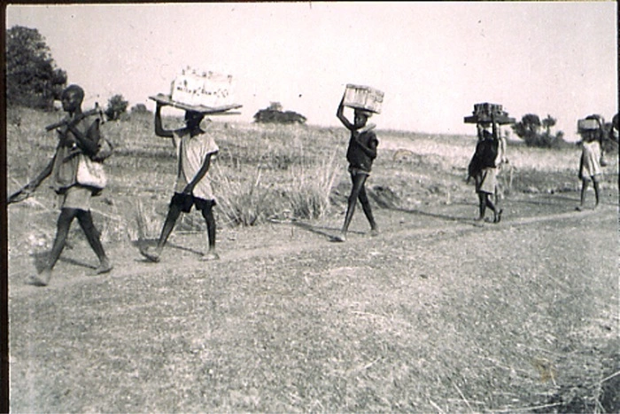It was soon decided that though the main roads were just passable to a loaded 3 ton lorry there was no chance of negotiating bush roads, the surface of which is at the best laterite and the width sometimes only the bare track of a car and bordered by a deep ditch to provide drainage in the heavy rains. Such roads are impassable to all wheeled traffic during the rainy season. Every few hundred yards there are culverts composed only of bush sticks covered with laterite, never very strong structures and towards the end of the dry season so weakened by white ants that they frequently give way beneath the weight of a car; dozens indeed did so. In view of transport difficulties a search was made in relatively accessible villages near the Black Volta but no onchocerciasis was found although trachoma and pterygium were common. It was decided therefore to adhere to the original idea of visiting Funsi, some 40miles direct, but 64 by road from Wa.’ At the last moment Dr. Browne most kindly offered to convey the party with minimal equipment to Wahabu on the river Kulp- wan whence a trek of some 12 miles would lead to Funsi. In actual fact despite difficulties it was found possible to drive right through, crossing the river by ford. On the return journey, however, the car ran off the road owing to a collapsing culvert, breaking a spring and damaging the steering. To save weight, much equipment was left behind at Wa. Only one steward boy was taken on and the medical equipment reduced to the slit-lamp, the projection lamp, a few operating instruments and essential drugs. Food consisted of five small loaves and a few tins of canned food. Twelve petrol tins of drinking water were carried and were just sufficient with care to last a week. The whole made up14 head loads varying from 20 to 68lbs.each. The 12bore and a borrowed express rifle were relied upon to augment the food supply for little, if anything, could be obtained from the villagers who had nothing to spare.