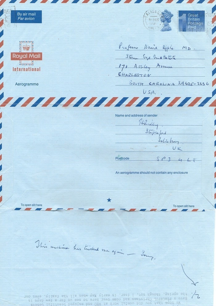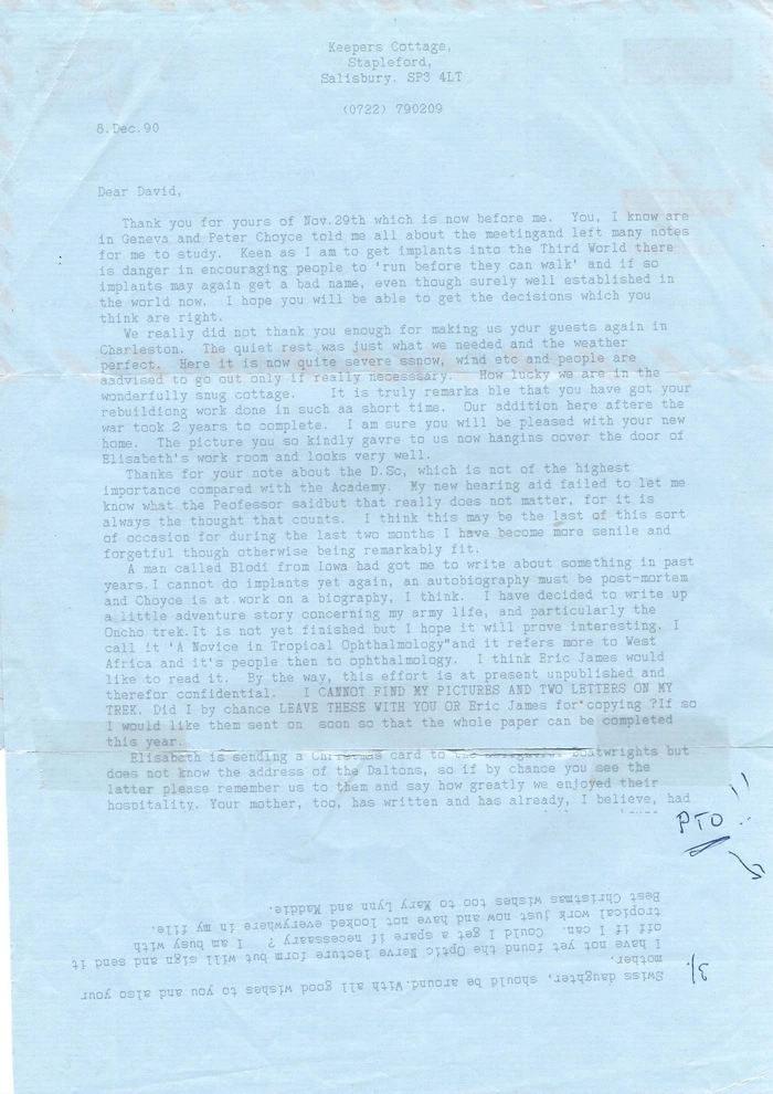 From the Archives of the David J Apple® Center for Vision Research, in a letter to David J Apple dated 8th December 1990, Ridley writes: