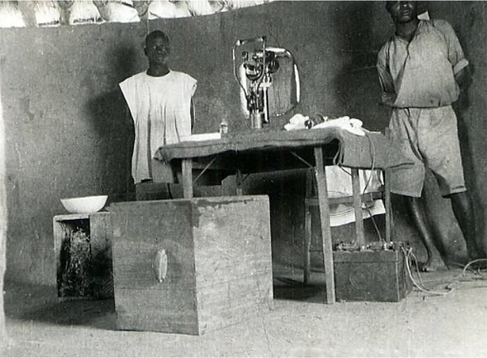 On departure, with mutual regret, presents were exchanged, and bearers provided to carry the equipment to Wahabu. Some were surprised by the weight of the accumulators, but the 12 miles were covered in 3hours. The man with the slit-lamp weighing 68lbs never left the party by 10 yards, he had been warned of its value and evidently attributed much “ ju-ju” to it. Electric light, of course, had never been seen before and, indeed, years may pass without the visit of a single white man. Fortunately two Sissalas spoke English and were invaluable as interpreters. They were intelligent men and explained the local customs and conditions. They said that the people recognised the importance of head nodules, which they called” Nukoli,”as a cause of blindness but attributed no harm to “Sangeli” nodules on the trunk. Two persons had visited a native surgeon at Belepong, the next village, to have head nodules excised, but most feared the native doctor.