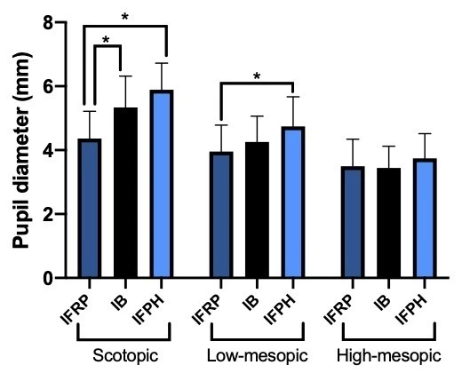 We measured pupil size using a Procyon P2000 pupillometer (Procyon Instruments Ltd, London, United Kingdom) at scotopic (0.04 lx), low-mesopic (0.4 lx) and high-mesopic (4 lx) light conditions. All the groups were measured 6-months after surgery and we did preoperative measurements for the IFPH- and IB-group.