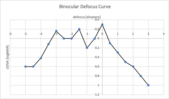 Figure 3: Binocular defocus curve 3 months after the IOL exchange. The curve shows the three foci of the trifocal supplementary IOL.