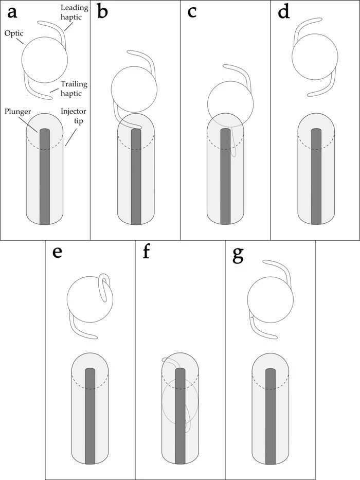 *Figure 1. Overview of common intraocular lens (IOL) misconfigurations during IOL implantation with an injector. (a) Normal IOL implantation without misconfiguration; (b) Adherence of the IOL to the plunger tip; (c) Trapped haptic of the IOL in the injector tip; (d) Upside-down configuration of the IOL; (e) Haptic-optic adhesion; (f) Overriding plunger in the injector tip; (g) Defect at the optic-haptic junction of the IOL.*