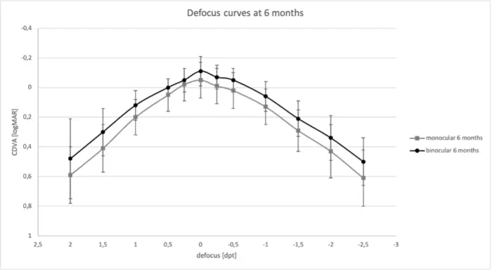 Figure 5: Defocus curves at 6 months: mean values for monocular and binocular CDVA (logMAR) and standard deviation are shown.