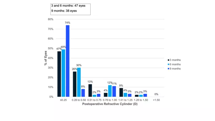Figure 2: The percentage of patients with a defined Postoperative Refractive Cylinder is shown at the 3, 6 and 9 months examinations.