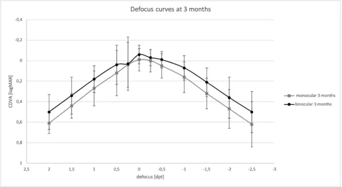 Figure 4: Defocus curves at the 3-month visit: mean CDVA values and standard deviation are shown in logMAR for monocular and binocular testing.