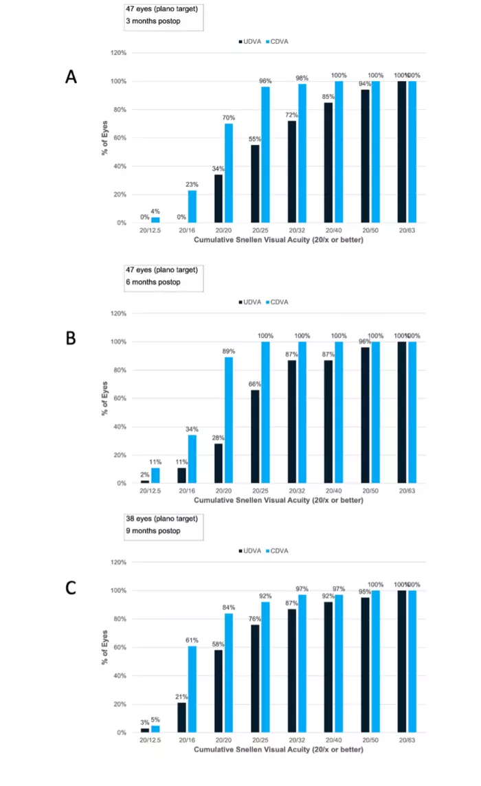 - Mean binocular UDVA was -0.02 ± 0.09 logMAR and mean binocular CDVA was -0.09 ± 0.09 logMAR