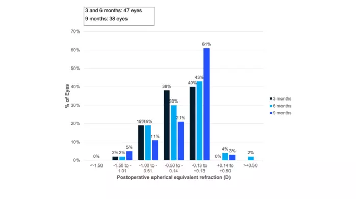Figure 1: Postoperative spherical equivalent refraction at 3, 6 and 9 months. The percentage of patients who achieved a certain range of spherical equivalent is shown for the three follow-up visits.